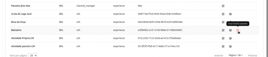 Na lista de experiências é possível visualizar as que não possuem fuso horário configurado pelo indicativo